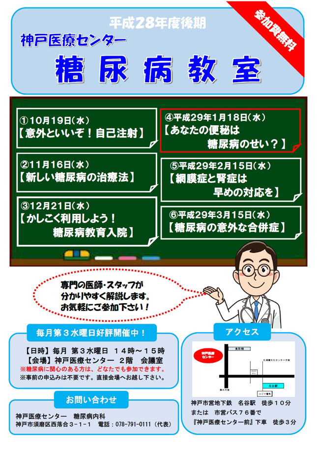 下記の通り「糖尿病教室」を開催いたします(平成29年度1月開催分)。