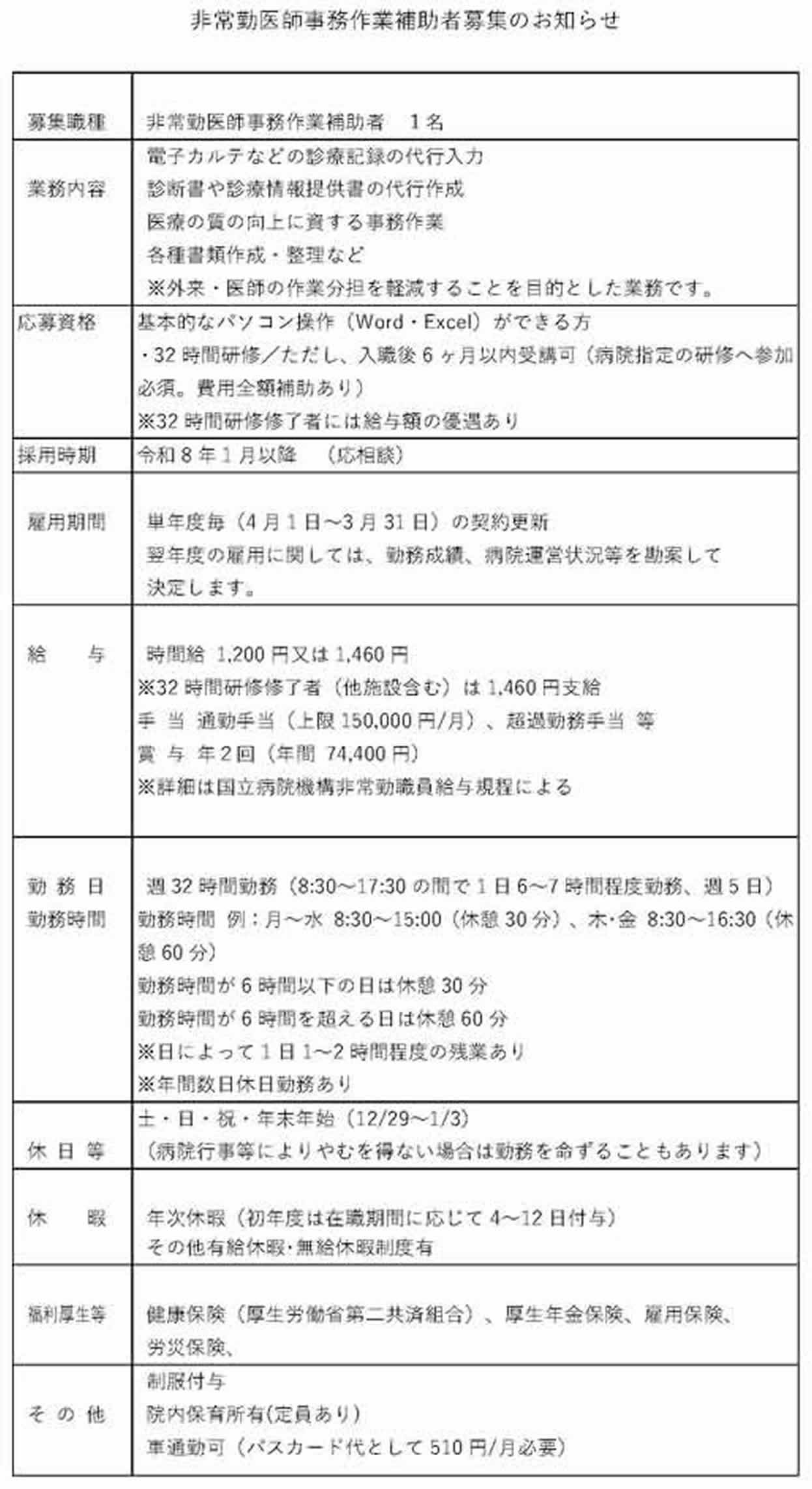 非常勤医師事務作業補助者募集のお知らせ 2025年10月24日 非常勤医師事務作業補助者募集のお知らせ 印刷用PDFはこちら ●応募方法 下記問い合わせ先に電話あるいはメール連絡の上、応募書類を下記提出先へ送付又は持参下さい。 ①応募書類履歴書、職務経歴書※履歴書に連絡可能なメールアドレスの記載をお願いいたします。 ②提出先 〒654-0155 神戸市須磨区西落合3-1-1 独立行政法人 国立病院機構 神戸医療センター 管理課 給与係 職員採用担当 宛 ●選考方法 書類審査、面接試験 ●選考日時 後日調整致します。 ※提出頂いた応募書類は返却致しませんのでご了承願います。 ●問合せ先 電 話 078-791-0111 担当者 管理課 採用担当 メール 412-kanrika@mail.hosp.go.jp