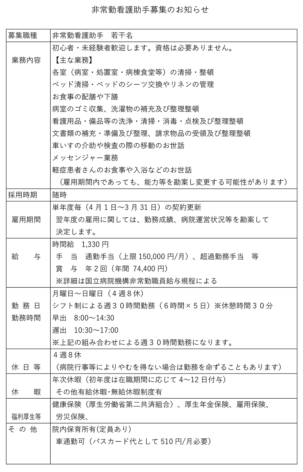 非常勤看護助手募集のお知らせ 2026年3月13日 非常勤看護助手募集のお知らせ 印刷用PDFはこちら ●応募方法 下記問い合わせ先に電話あるいはメール連絡の上、応募書類を下記提出先へ送付又は持参下さい。 ①応募書類履歴書、職務経歴書※履歴書に連絡可能なメールアドレスの記載をお願いいたします。 ②提出先 〒654-0155 神戸市須磨区西落合3-1-1 独立行政法人 国立病院機構 神戸医療センター 管理課 給与係 職員採用担当 宛 ●選考方法 書類審査、面接試験 ●選考日時 後日調整致します。 ※提出頂いた応募書類は返却致しませんのでご了承願います。 ●問合せ先 電 話 078-791-0111 担当者 管理課 採用担当 メール 412-kanrika@mail.hosp.go.jp